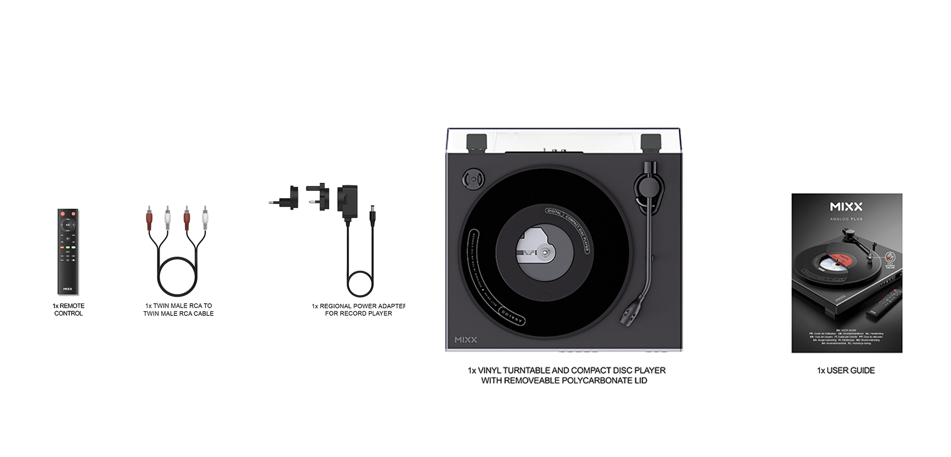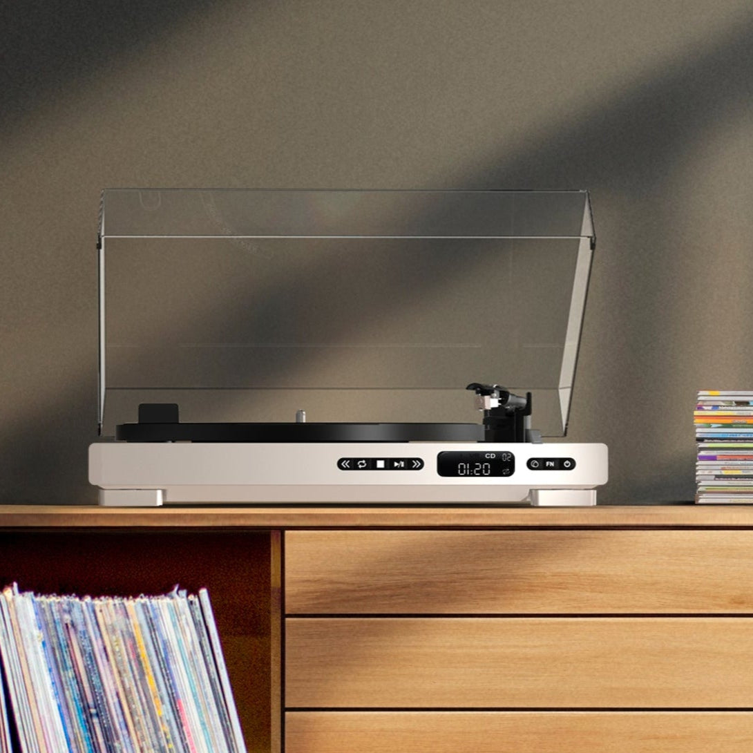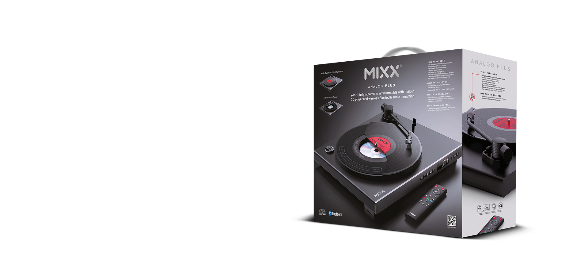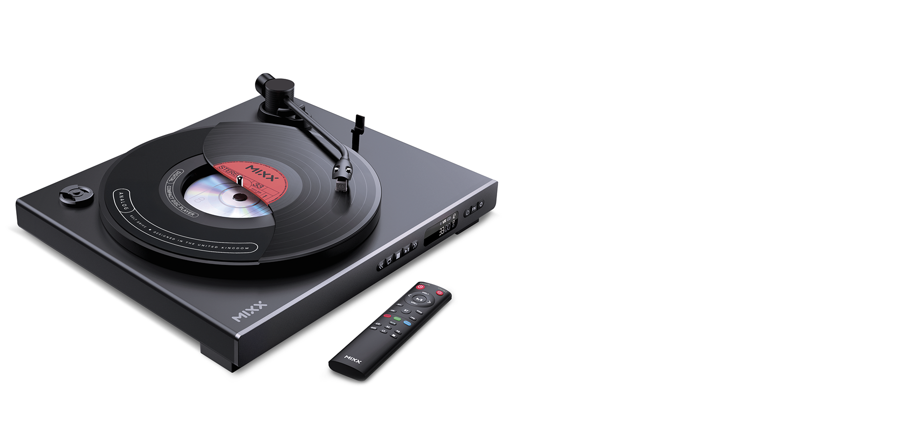 Bring your music collection back to life with the Mixx Analog Plus – a sleek, fully automatic turntable with an integrated CD player. Enjoy smooth 33/45 RPM vinyl playback, full tonearm automation, and remote-controlled convenience. Transmit audio wirelessly via Bluetooth or connect to your existing sound system using AUX out. With track number and time display, skip and repeat features, and playback controls on both the unit and IR remote, the Analog Plus makes listening effortless. Whether you’re spinning 12” classics or compact discs, this all-in-one music system combines retro style with modern functionality. Perfect for vinyl lovers, CD collectors, and anyone ready to enjoy the full experience of physical media again.
