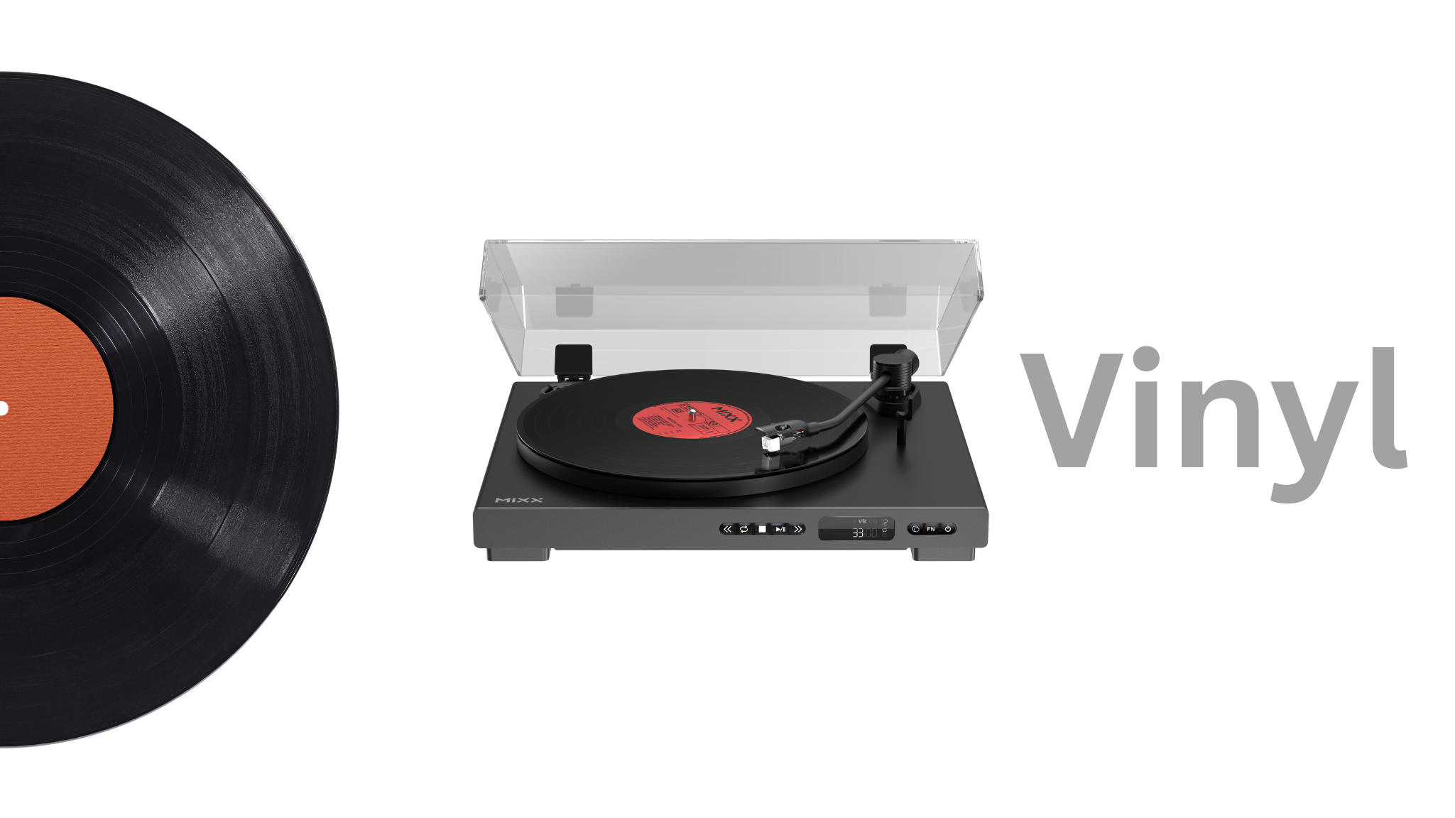 Bring your music collection back to life with the Mixx Analog Plus—a sleek, fully automatic turntable with a built-in CD player and modern connectivity. Enjoy smooth 33/45 RPM vinyl playback, full tonearm automation, and simple control using the onboard buttons or included IR remote. The Analog Plus supports both 12” and 7” records, with auto speed control, skip, and repeat functions for effortless listening.